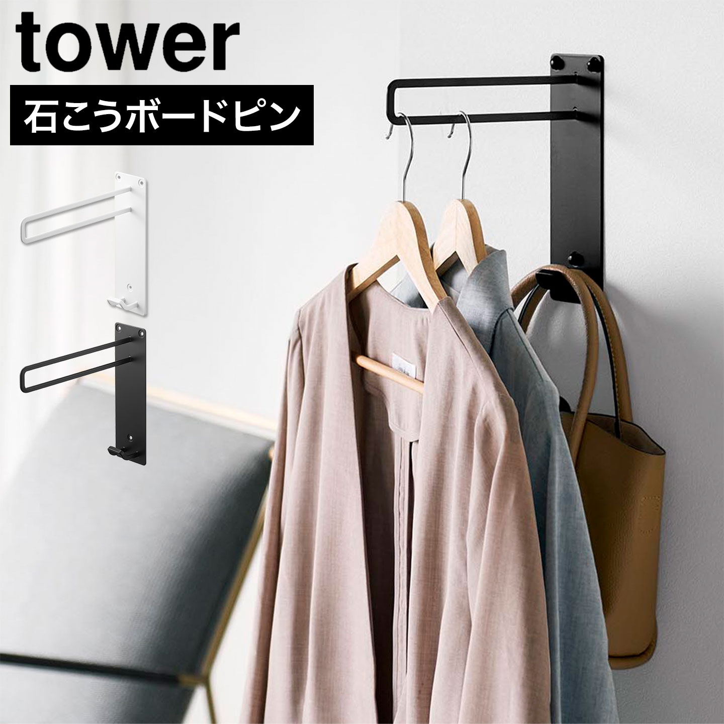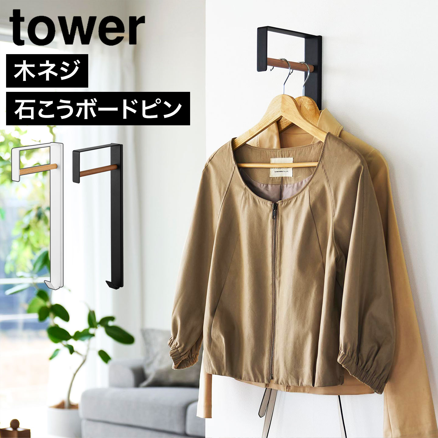 ハンガーフック 壁付け 山崎実業 タワー tower 公式 10407 10408 壁付けコートハンガー 賃貸OK コート掛け 洋服掛け コートハンガー バッグ 子供部屋 玄関 リビング 石こうボードピン 石膏ボードピン 木製 フック スリム モノトーン ホワイト ブラック シンプル おしゃれ