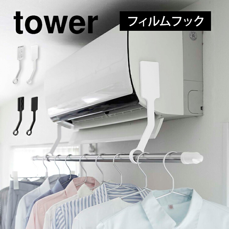 フィルムフックエアコン室内物干しポールホルダー タワー 山崎実業 物干し竿受け 室内 部屋干し グッズ エアコン 下 ホルダー 乾きやすい シンプル 省スペース エアコン下 有効活用 洗濯物 ホワイト ブラック 速乾 除湿 暖房 省エネ ドライバー不要 6308 6309 tower