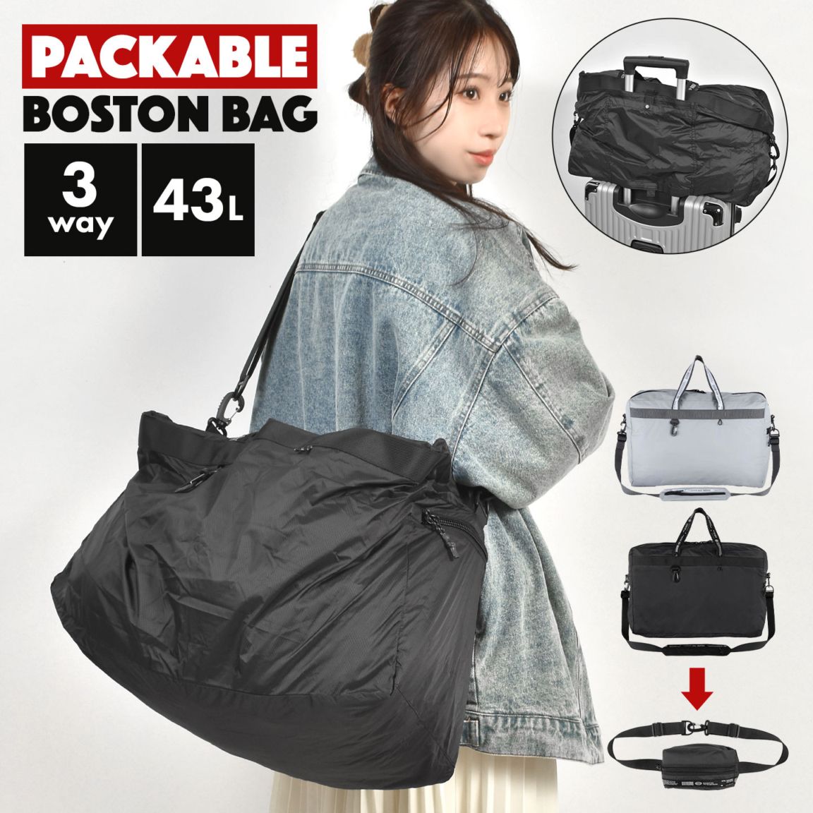 ボストンバッグ 旅行 バッグ WEEKENDER ウィークエンダー メンズ レディース 旅行用 パッカブル 折りたたみ コンパクト 大容量 軽量 機内持ち込み キャリーオン 黒 ブラック グレー 無地 シンプル 2泊 43L ショルダー付き 斜めがけ ナイロン 出張 大きめ ショルダーバッグ