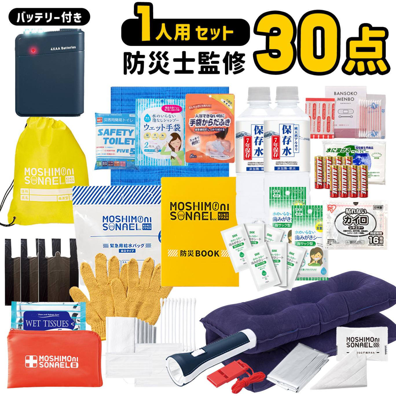 防災セット 1人用 30点セット 避難セット 防災グッズ 中身だけ モシモニソナエル 災害対策グッズ 防災士監修 避難用品 非常用持ち出し袋 持ち運び 保存水 7年間 長期保存 備蓄 モバイルバッテリー 充電器 電池 ライト 携帯トイレ ホイッスル コンパクト 地震 災害 停電 対策