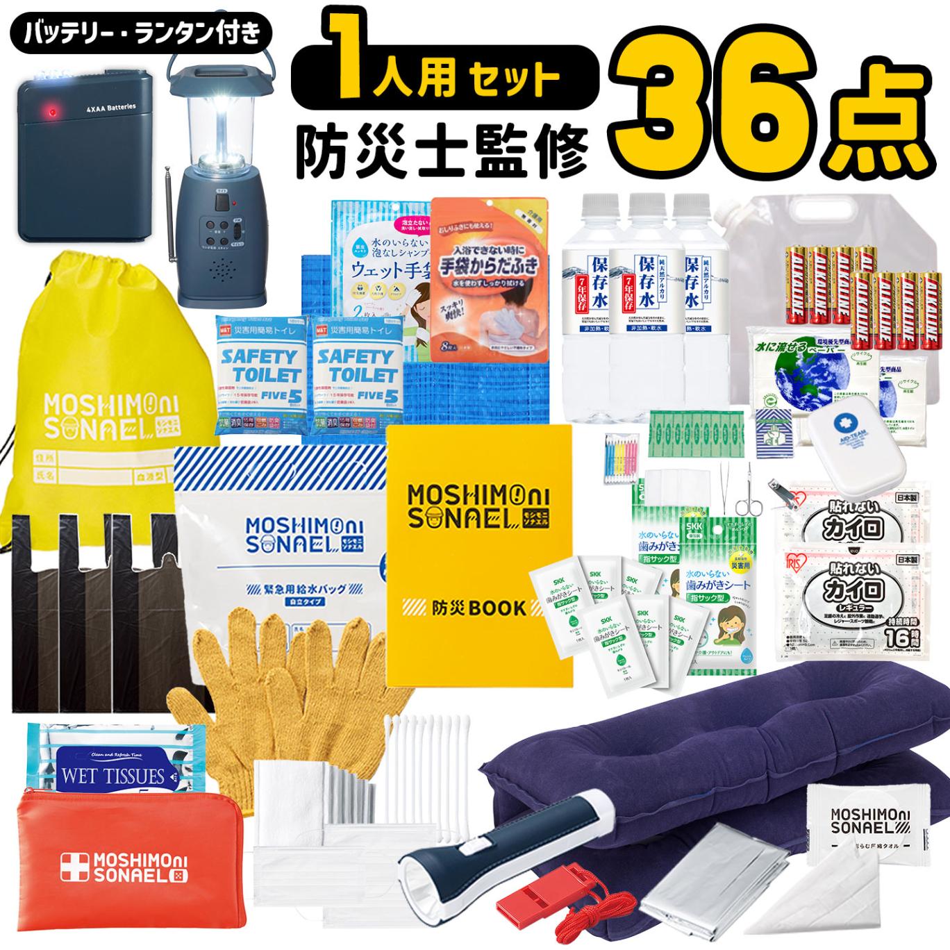 防災セット 1人用 36点セット 避難セット 防災グッズ 中身だけ モシモニソナエル 災害対策グッズ 防災士監修 避難用品 非常用持出袋 保存水 長期保存 7年間 備蓄 モバイルバッテリー 充電器 目隠し ライト ラジオ 電池式 手回し ソーラー 携帯トイレ ホイッスル LEDランタン
