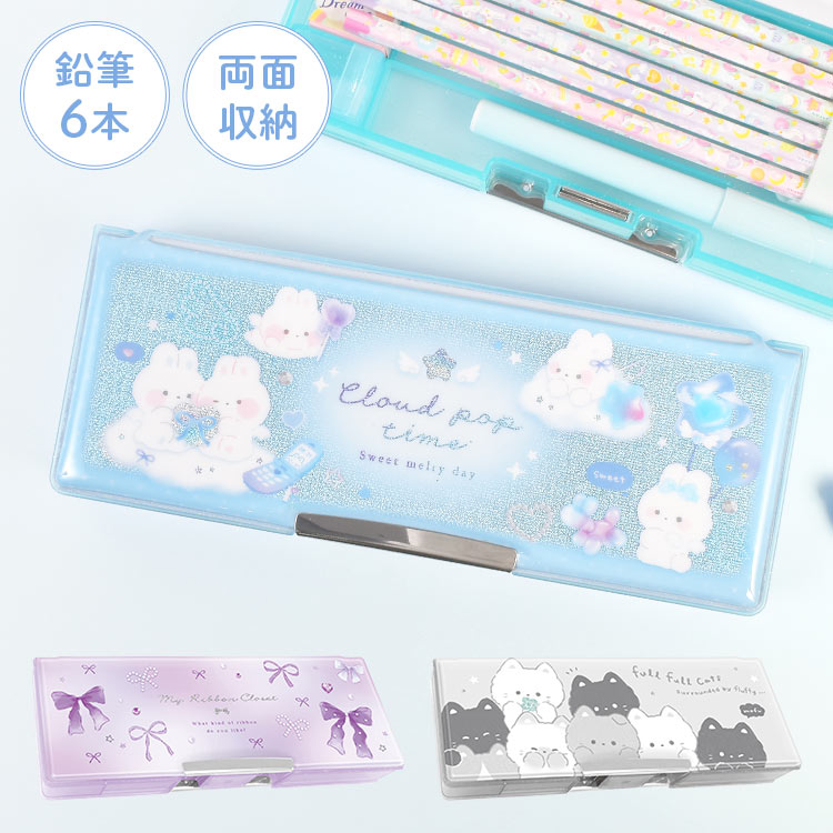 ペンケース 小学生 筆箱 女の子 文房具 両面ペンケース 両面筆箱 クリア 透明 箱型 ふでばこ 三角定規 収納 時間割表 鉛筆削り付き 軽量 コンパクト パープル ブルー 猫 ハート キラキラ おしゃれ 子供 女子 小学校 入学 準備 入学祝い 新学期 新一年生 低学年