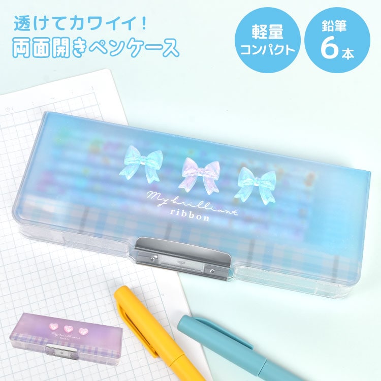 筆箱 小学生 箱型 ペンケース 女の子 文房具 リボン ハート 両面筆箱 かわいい ふでばこ クリア 半透明 おしゃれ 小学校 入学 準備 入学祝い 女子 子供 文具 両面ペンケース 三角定規 収納 時間割表 鉛筆削り付き 軽量 コンパクト 新学期 新一年生 低学年 パープル ブルー