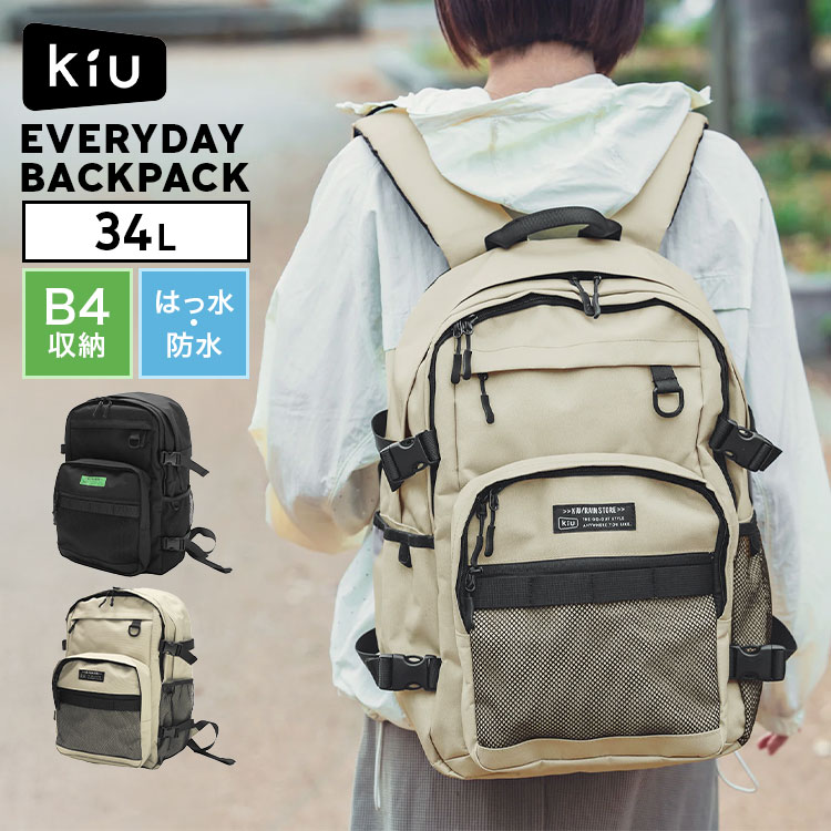 エブリディ バックパック KiU キウ K525 レディース メンズ 撥水 防水 大容量 B4 34L 15インチ PC収納 ポケット 多い 軽量 大きめ リュックサック デイパック チェストベルト付き デイジーチェーン おしゃれ 黒 ブラック ベージュ 通勤 通学 高校生 一泊 旅行 アウトドア