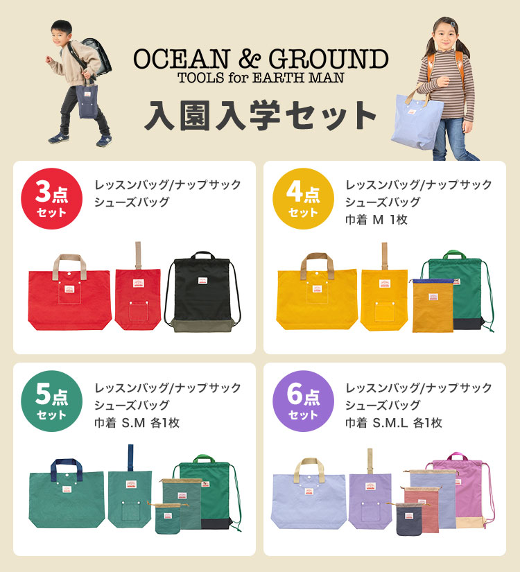 入園入学セット 6点セット オーシャンアンドグラウンド OCEAN&GROUND 女の子 男の子 キッズ セット販売 入学準備 保育園 小学校 ナップサック レッスンバッグ シューズバッグ 巾着 コップ袋 上履き入れ 手提げ 体操服袋 幼稚園 小学 一年生 2026年 入園グッズ