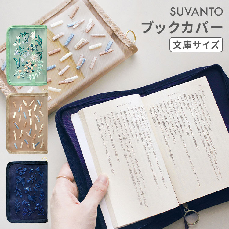 ブックカバー 文庫 SUVANTO かわいい おしゃれ 文庫本 文庫カバー 読書カバー メッシュ 刺繍 ファスナー付き 持ち運び 持ち歩き 読書 本 カバー 花柄 フラワー 植物 ボタニカル シンプル 北欧 ミント ベージュ ネイビー 文学 女性 通勤 母の日 ギフト 誕生日 プレゼント