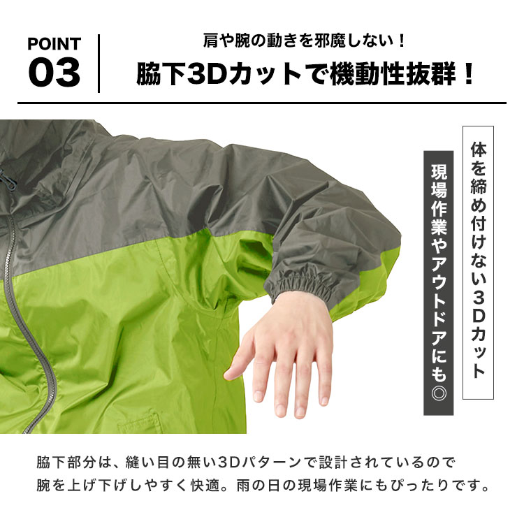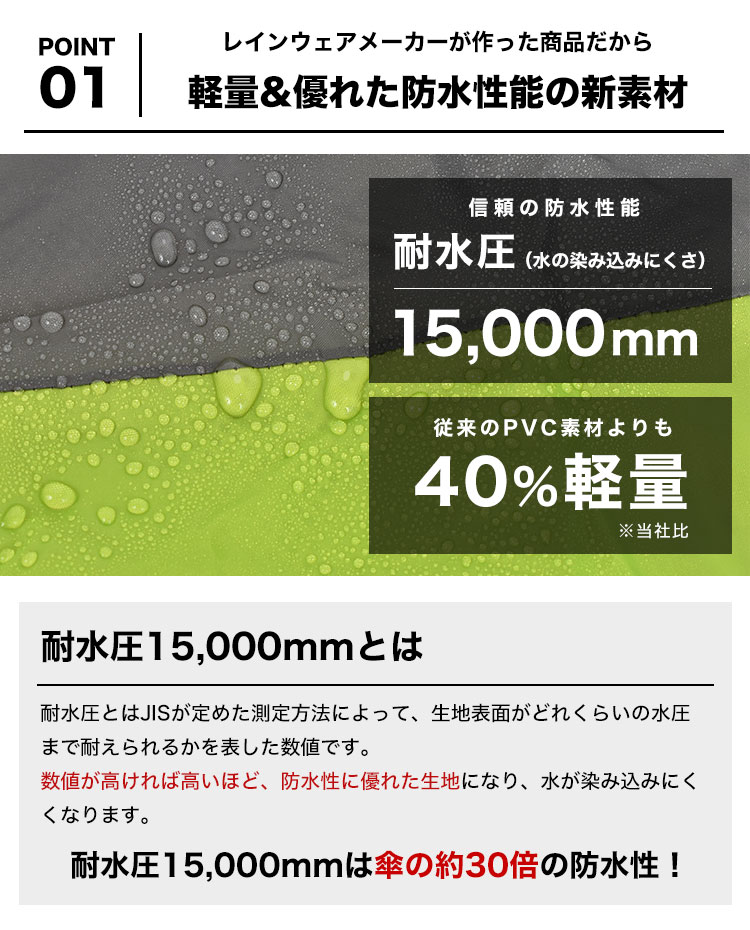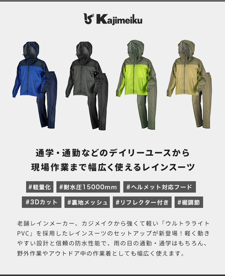 老舗レインメーカー、カジメイクから強くて軽い「ウルトラライトPVC」を採用したレインスーツのセットアップが新登場!従来のPVC素材より40%軽量で、更に軽く動きやすくなりました。防水性は信頼の耐水圧15,000mm。裏面はメッシュ生地なのでベタつかず快適です。フードはヘルメット対応で、リフレクターや裾幅調整ボタンなど機能性も◎雨の日の通勤・通学はもちろん、野外作業やアウトドア中の作業着としても幅広く使えます。