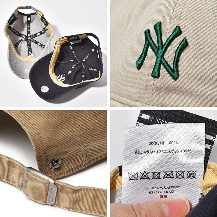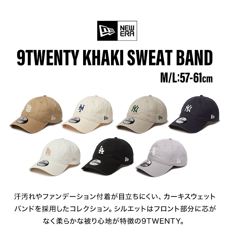 汗汚れやファンデーション付着が目立ちにくい、カーキスウェットバンドを採用したコレクション。MLB6球団をラインナップ。シルエットはフロント部分に芯がなく柔らかな被り心地が特徴の9TWENTY。リアのイージースナップ(サイズ調整するストラップ)でサイズ調整が可能です。