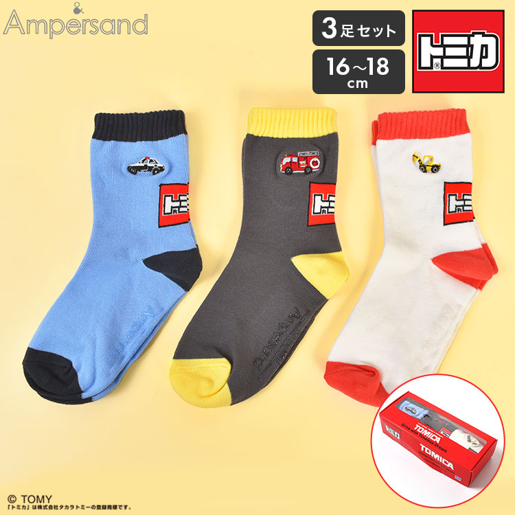 トミカ TOMICA 靴下 キッズ ソックス 男の子 子供 アンパサンド Ampersand コラボ 3足セット くつ下 16cm 17cm 18cm 青 白 グレー おしゃれ かわいい 車 クルマ 滑り止め クルーソックス 保育園 幼稚園 園児 幼児 男児 4 5 6歳 誕生日 クリスマス プレゼント ギフト 箱付き