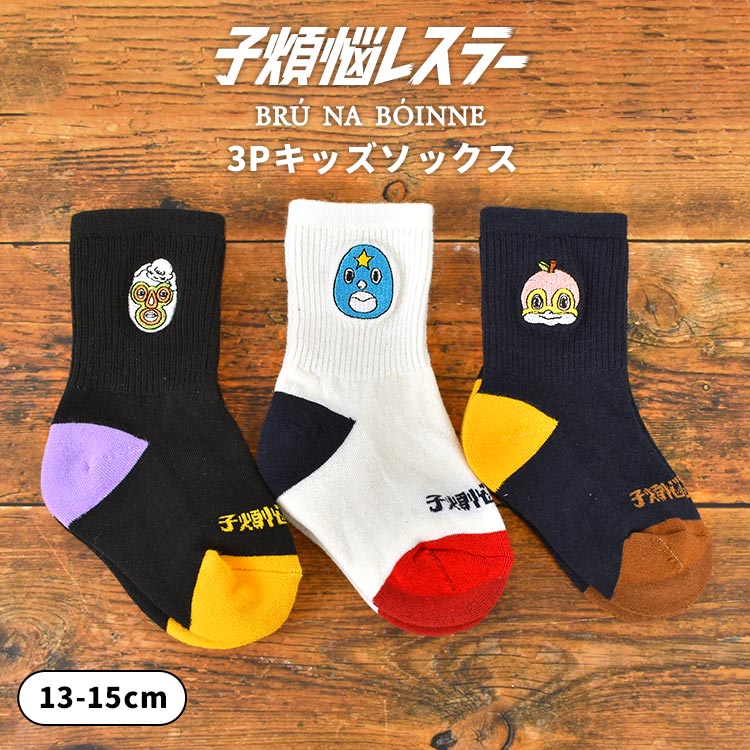 靴下 3P 子煩悩レスラー BRU NA BOINNE ブルーナボイン 子供 キッズ 3足セット 厚手 13 14 15 cm 白 黒 紺 ホワイト ブラック ネイビー プロレス ベビー 子ども 男の子 女の子 ブランド かわいい 可愛い おもしろ おしゃれ クルーソックス クルー丈 ワンポイント 刺繍 ロゴ