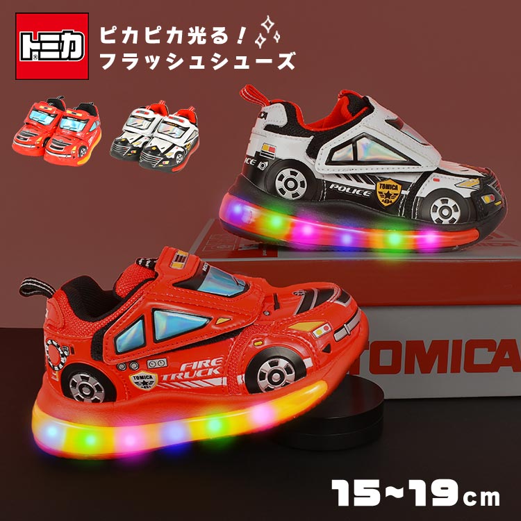 光る靴 スニーカー キッズ 男の子 15 16 17 18 19 cm トミカ パトカー 消防車 子供 子ども キッズシューズ 靴 軽量 かっこいい ピカピカ 光る 運動靴 やわらかい 軽い 車 好き 赤 黒 白 カラフル 孫 息子 誕生日 クリスマス プレゼント TOMICA 幼稚園 小学生 通園 通学