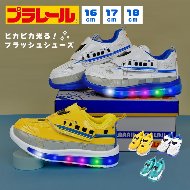 キッズ スニーカー 光る靴 プラレール 電車 新幹線 ドクターイエロー N700S ハヤブサ かがやき こまち 男の子 子供靴 16 17 18 cm フラッシュ LED ピカピカ 点滅 軽量 運動靴 キッズシューズ かっこいい 幼稚園 小学生 履きやすい 歩きやすい やわらかい