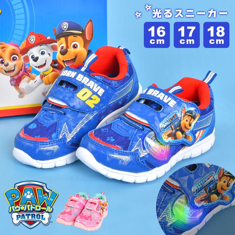 光る靴 スニーカー パウパトロール キッズ 男の子 女の子 シューズ 16 17 18cm キャラクター 子ども 子供 軽い 軽量 柔らかい かわいい 光る キラキラ ピカピカ 運動靴 息子 娘 幼稚園 保育園 チェイス スカイ 青 ブルー ピンク 誕生日 お祝い クリスマス ギフト プレゼント