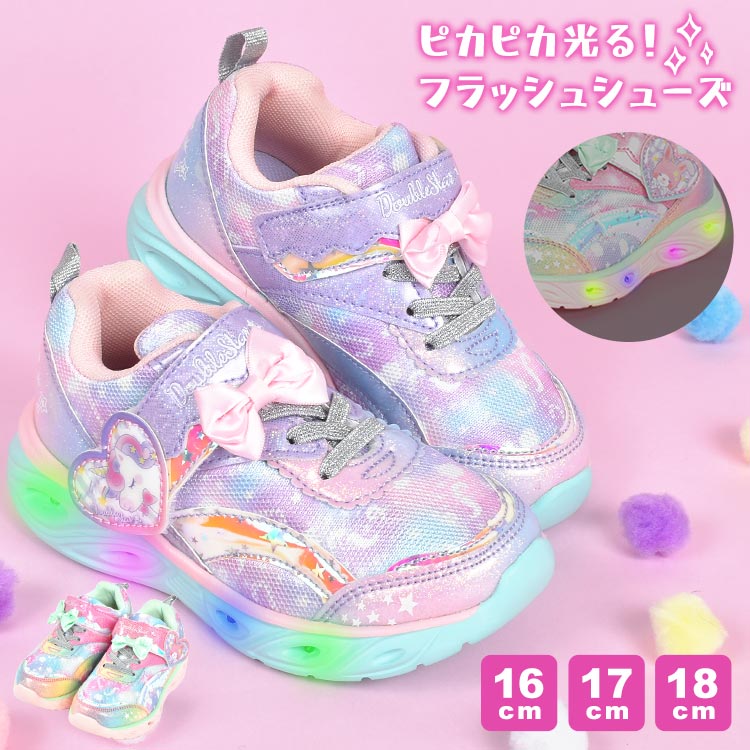 スニーカー キッズ 子供靴 女の子 光る靴 Double Star ダブルスター 16cm 17cm 18cm 軽量 運動靴 シューズ おしゃれ 可愛い 柔らかい 幼稚園 保育園 3歳 4歳 5歳 6歳 プレゼント 白 ホワイト パープル ユニコーン オーロラ レインボー キラキラ ピカピカ