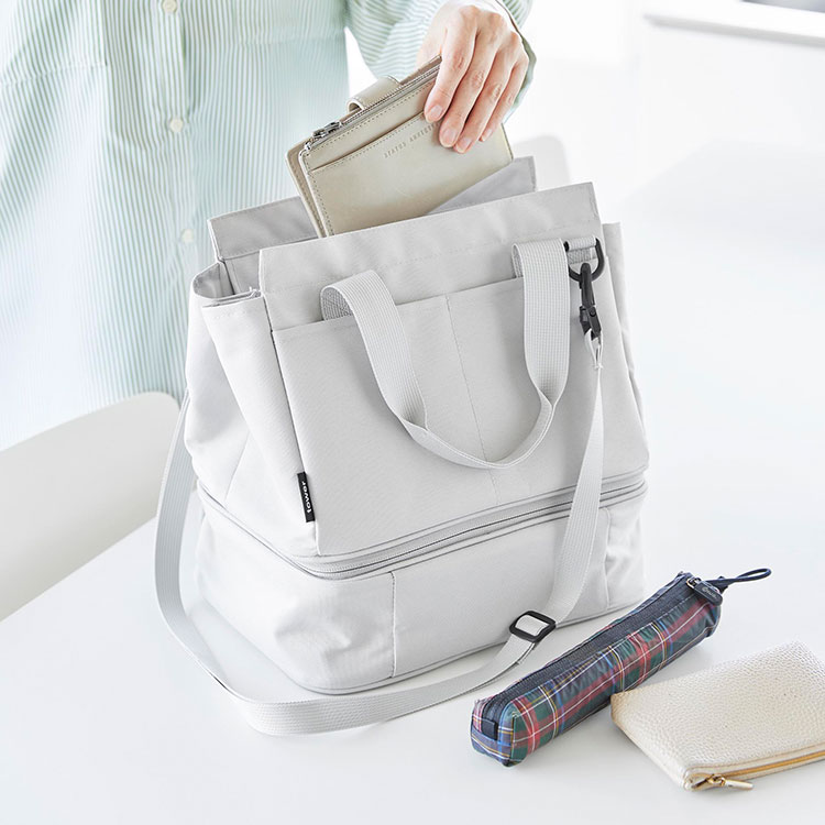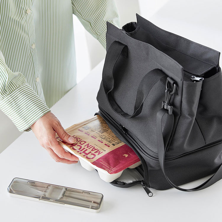 ![]() ![]() ![]() ![]() 用途に合わせてセパレート使いができる、便利なランチバッグ バッグ持ちでそのまま使用するのはもちろん、上下を切り離して使用できるので、下段を通勤通学バッグに入れての使用もOK!上段は普段使いのバッグとしても活躍します。シーンに合わせて使い分けができるので幅が広がります。 ![]() 下段は取り出し口が大きく開くから、荷物の出し入れがスムーズ シンプルな見た目だけど機能はいっぱい!下段内側にはカトラリーが固定できるゴムバンド付でき持ち運びも安心です。お弁当箱が入るのはもちろん、500mLのペットボトルが3本収納可能! ※下段のみ、保温保冷機能付き ![]() 下段はおうちで丸洗いOK!いつもで清潔に保てます ![]() 外ポケットが2つ付いており、小物収納にも便利です。 上段フロントには、サッと取り出したいスマホやパスケースを入れるのに便利な深さのあるフロントポケット付き。 ![]() ファスナー付きなので中身が見えず安心◎ ![]() サイドボタンでサイズ感を調整でき、スリムにも◎ ![]() ショルダーストラップ付きで持ち方も2way仕様 ![]() ![]() ![]() ![]() ![]() ![]() ![]()